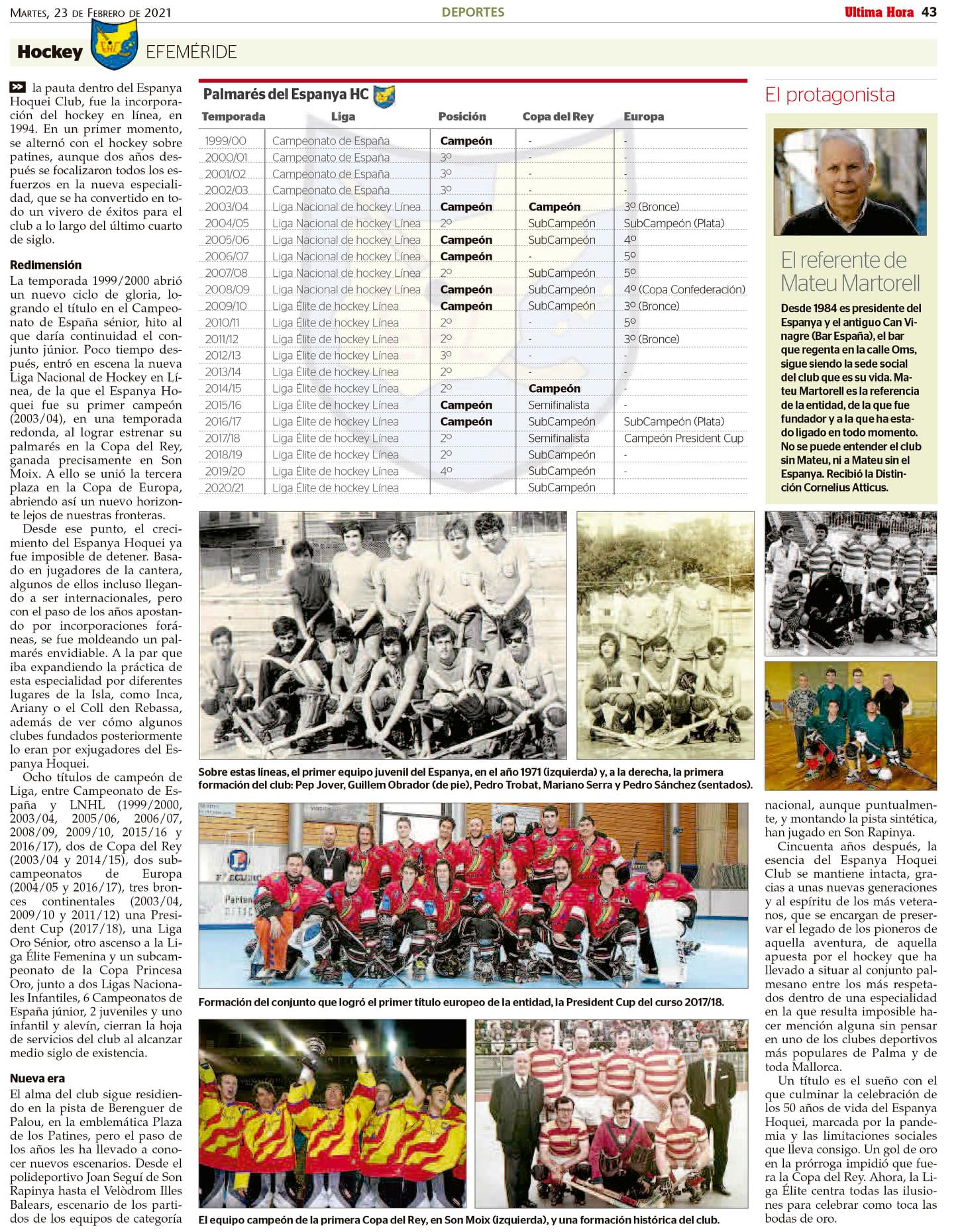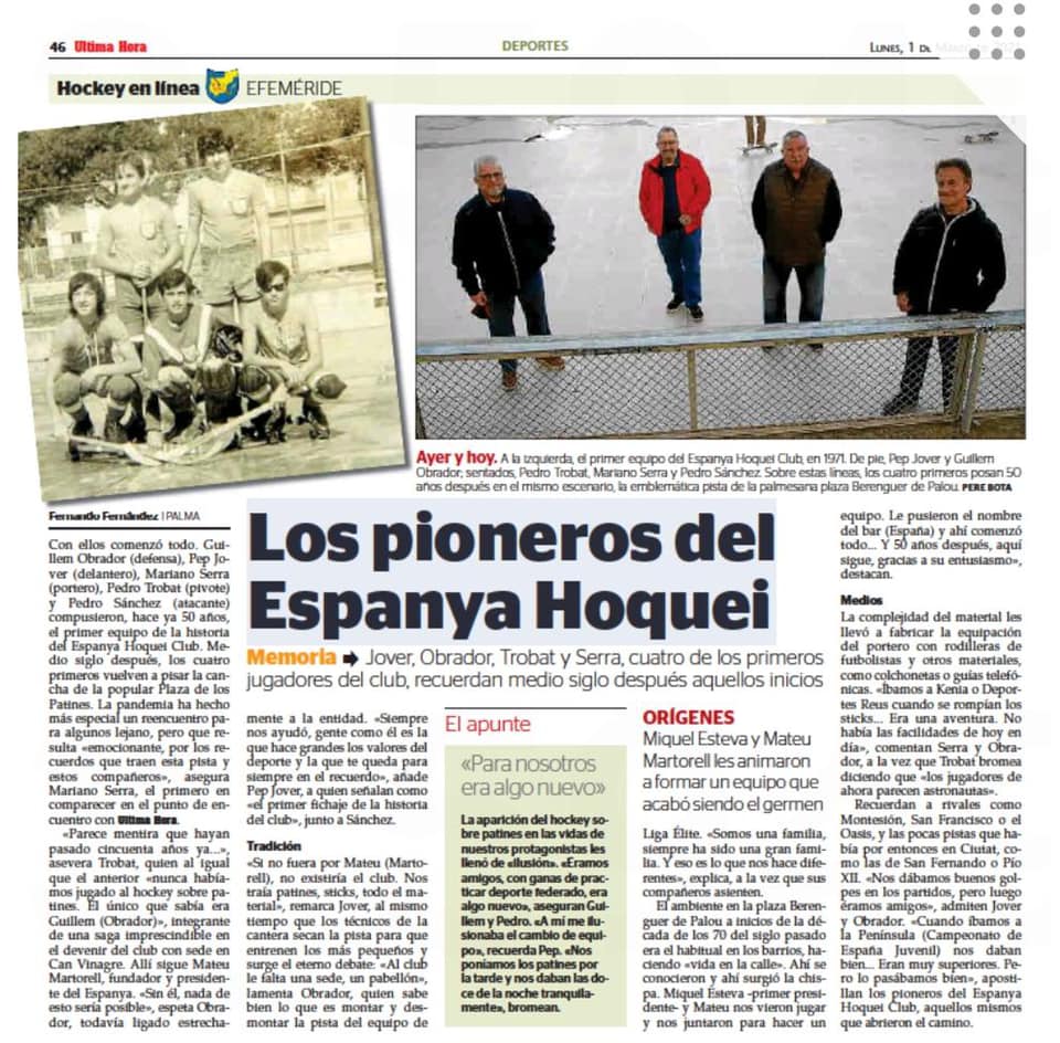 Lejos queda el año 1971, cuando un grupo de personas vinculadas al hockey sobre patines, que hizo de la plaça Bisbe Berenguer de Palou -la popular Plaza de los Patines- su punto de reunión, fundó el Espanya, al que da nombre el conocido bar de la calle Oms, sede social del club y donde se concentran miles de recuerdos. El actual presidente, Mateu Martorell, su primer mandatario, Miquel Esteva, Joan Jaume o Joan Riudala fueron algunos de los pioneros de una institución que empezó con un equipo infantil, junto a un Sénior que luchó por ascender a Primera División, y en 1972 se formó un juvenil con amigos y familiares del absoluto. Esta estructura se mantuvo hasta 1979, lográndose un año antes el ascenso a Primera, lo que provocó un cambio importante en el club, que contaba con diez equipos -incluyendo una escuela-, y multiplicó sus éxitos a escala territorial y nacional.