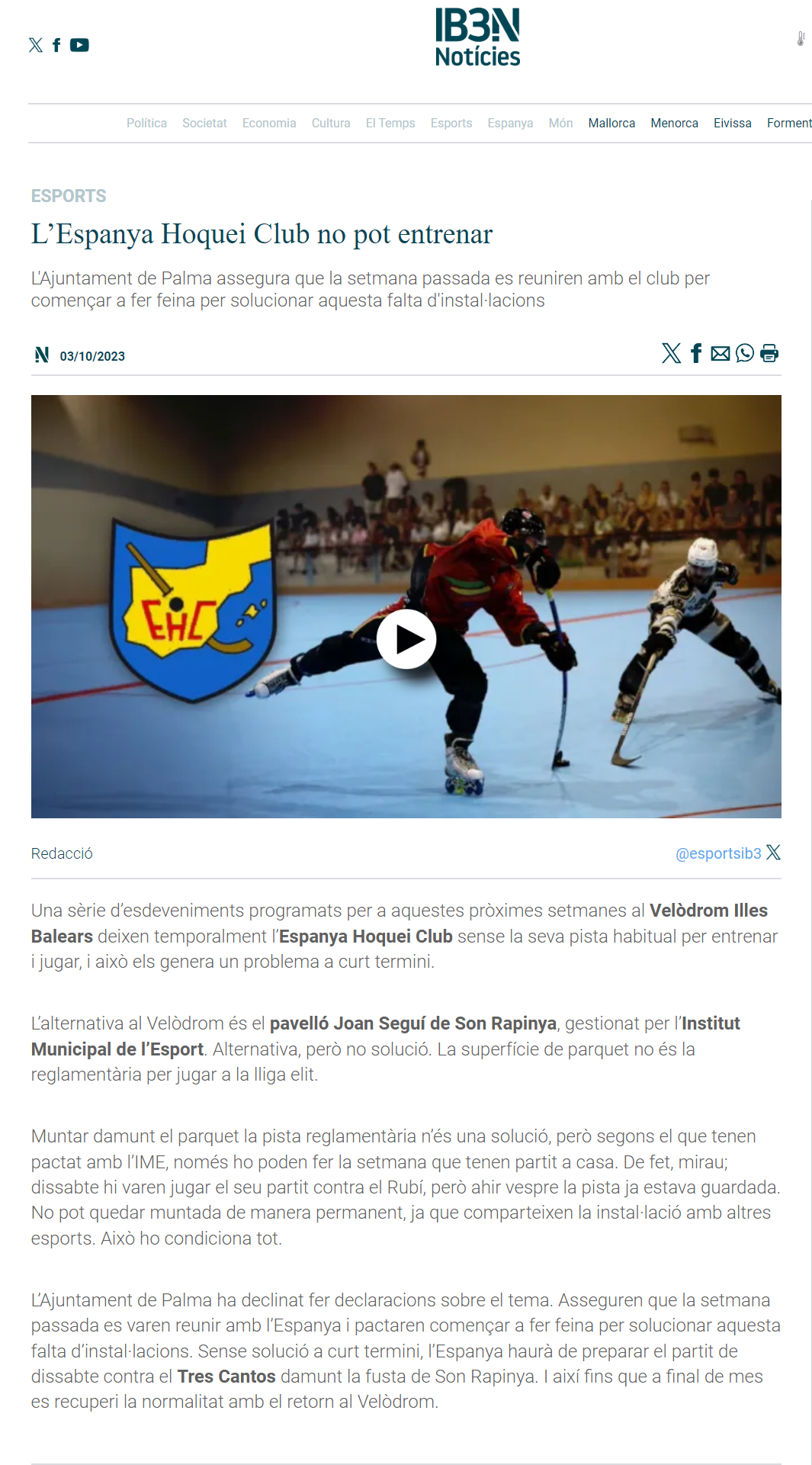 El Espanya Hockey Club, uno de los clubes más exitosos de Mallorca y de España en hockey en línea, se encuentra en una situación crítica. El club, que participa en la Liga Nacional Elite, la máxima categoría del hockey en línea español, no puede entrenar a la falta de un pabellón adecuado.
