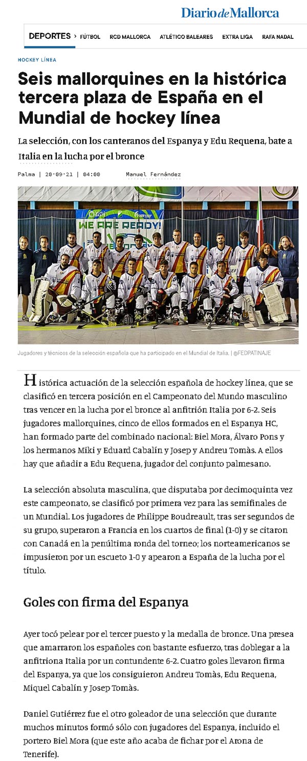 | Medalla de bronze per a la selecció espanyola de hockey en línia en el Mundial sènior masculí que es disputa a Roccaraso 🇮🇹 La nostra més sincera enhorabona als jugadors del @espanyahc i jugadors mallorquins que hi participen@GOIB_Social@cgonyalons 📸: @espanyahc pic.twitter.com/bvNEUfUgcA— esportsIB (@esportsIB) September 19, 2021 |